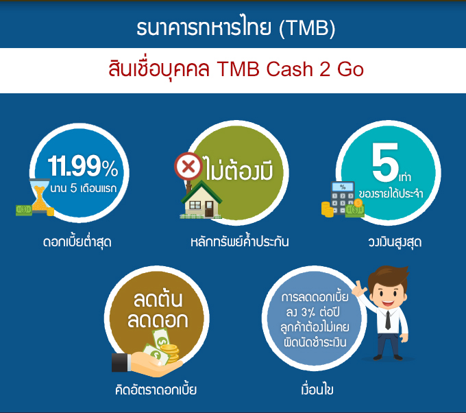 ธนาคารทหารไทย | สินเชื่อบุคคล TMB Cash 2 Go | - สามารถลดดอกเบี้ยลง 3% ต่อปี จากดอกเบี้ยปกติ ได้ทุกเดือน