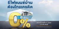 - ธนาคารไทยเครดิต >> สินเชื่อรีไฟแนนซ์บ้าน >> ดอกเบี้ยต่ำ 0% นาน 6 เดือน เฉลี่ย 3 ปีแรก 2.50% ต่อปี >> ไม่กำหนดระยะเวลา