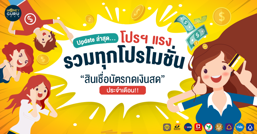 - ข้อมูลของโปรโมชั่นสินเชื่อบัตรกดเงินสดของแต่ละธนาคารที่นำเสนอ เป็นโปรโมชั่นสำหรับผู้กู้ในนามบุคคลธรรมดาและเป็นโปรโมชั่นเด่นของแต่ละธนาคาร ซึ่งจะไม่รวมโปรโมชั่นพิเศษที่สาขาธนาคารอาจเสนอให้ลูกค้าประจำ หรือลูกค้าพิเศษเป็นครั้งคราว