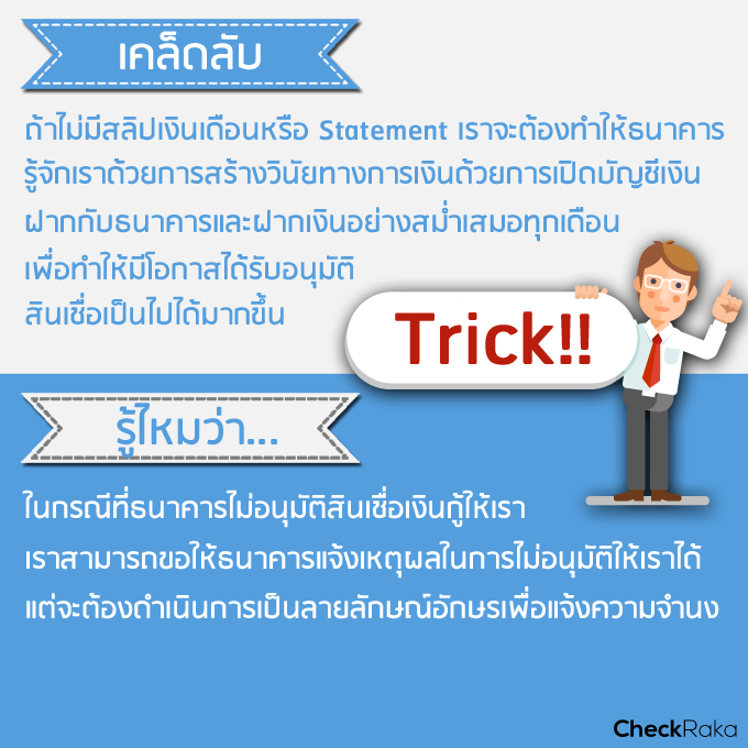 - เอกสารแสดงรายได้ คือ สลิปเงินเดือน หรือใบรับรองเงินเดือนๆ ล่าสุด (ใช้อย่างใดอย่างหนึ่ง) พร้อมกับรายการเคลื่อนไหวบัญชีเงินฝากของตัวเราเอง หรือถ้าสมัครในกรณีทำธุรกิจส่วนตัวก็ต้องเป็นบัญชีเงินฝากในนามของกิจการที่ทำอยู่ อย่างน้อย 6 เดือน