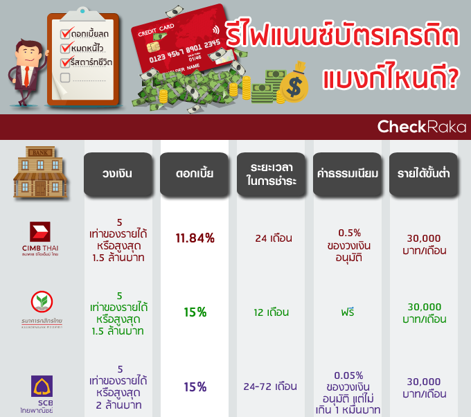 CheckRaka.com ได้ทำให้ทุกอย่างง่ายขึ้นด้วยการนำสินเชื่อรีไฟแนนซ์ของธนาคารชั้นนำหลายๆ ธนาคารมาเปรียบเทียบให้ได้รู้กันว่า เราควรจะเลือกขอกู้สินเชื่อรีไฟแนนซ์บัตรเครดิตของเราในครั้งนี้ักับธนาคารไหนดีที่สุด และเหมาะกับเราที่สุด