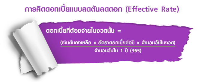 การคิดดอกเบี้ยแบบลดต้นลดดอก (Effective Rate) เป็นการคิดทีละงวดจากยอดเงินต้น คงเหลือที่ทยอยลดลงในแต่ละงวด