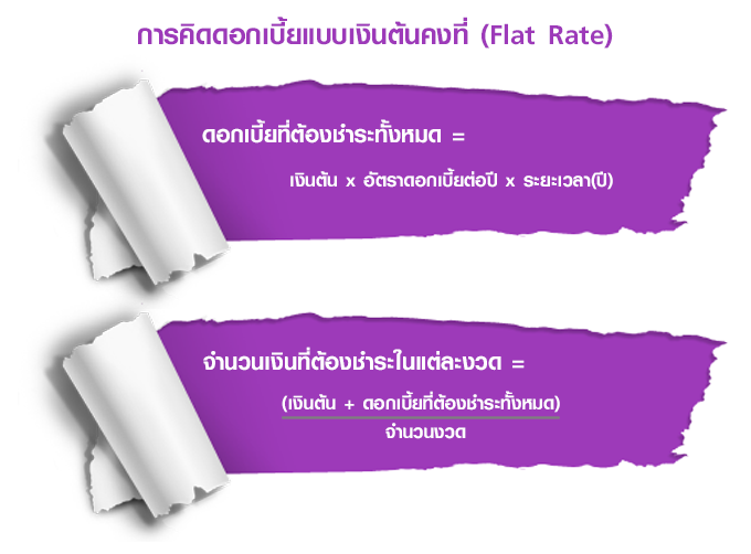 การคิดดอกเบี้ยแบบเงินต้นคงที่ (Flat Rate) เป็นการคิดดอกเบี้ยจากเงินต้นทั้งจำนวนและระยะเวลาในการผ่อนชำระทั้งหมด จากนั้นก็จะเอาดอกเบี้ยที่คำนวณได้มารวมกับเงินต้น แล้วหารด้วยจำนวนงวดที่จะผ่อนชำระ ก็จะได้เงินที่ผ่อนชำระที่เท่ากันทุกงวด