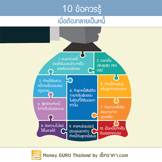 ใครจะทวงหนี้เราได้บ้าง? เพื่อป้องกันการทวงหนี้นอกระบบ คนที่จะทวงหนี้เราได้ จะต้องเป็นผู้ได้รับจดทะเบียนประกอบธุรกิจทวงถามหนี้ต่อนายทะเบียนกระทรวงมหาดไทย แม้แต่ผู้ที่เป็นทนายความ (หรือสำนักงานทนายความ) ที่ได้รับการว่าจ้างเพื่อไปทวงถามหนี้ ก็ต้องมีการรับรองขึ้นทะเบียนจากสภาทนายความด้วย ส่วนผู้ที่จะมาทำหน้าที่ทวงถามหนี้เรานั้น ก็ต้องเป็นผู้ได้รับมอบอำนาจจากเจ้าหนี้ หรือสถาบันการเงิน โดยต้องมีหนังสือมอบอำนาจมาด้วย เพื่อแสดงเป็นหลักฐานว่าได้รับมอบอำนาจมาจริง