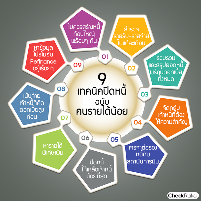 CheckRaka.com มี 9 เทคนิคปิดหนี้ฉบับคนรายได้น้อย ที่ใครๆ ก็ทำได้ มาฝากเพื่อนๆ ที่กำลังเจอปัญหานี้อยู่ค่ะ เริ่มจากตั้งสติและทำตามเทคนิคดังนี้ค่ะ