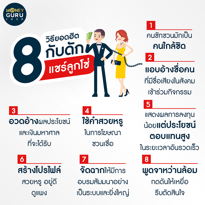 - เมื่อมีกิจกรรมหรือจัดอบรมที่เราดูแล้วไม่แน่ใจก็ควรหลีกเลี่ยง เพราะมิจฉาชีพพวกนี้จะใช้จิตวิทยาหว่านล้อมให้ร่วมลงทุนโดยที่เราไม่รู้ตัว หรือถ้ามารู้ตัวทีหลังก็สายไปแล้ว