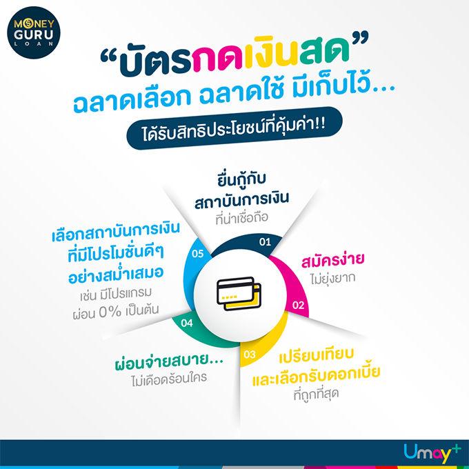 "บัตรกดเงินสด" เป็นสินเชื่อที่หลายคนไม่ค่อยอยากจะขอกู้ เนื่องจากมีอัตราดอกเบี้ยค่อนข้างสูง โดยจะถูกกำหนดไว้ด้วยเพดานดอกเบี้ยในอัตราสูงสุด 25% ต่อปี แต่รู้กันไหมค่ะว่า...สินเชื่อบัตรกดเงินสดนี้ ถ้าเราเลือกเป็น ใช้เป็น รับรองได้ว่าจะได้รับประโยชน์จากบัตรนี้คุ้มค่ามากเลยทีเดียว ซึ่งเราจะต้องมีความรู้และทำความเข้าใจกับผลิตภัณฑ์นี้ให้มากขึ้น เพื่อรับสิทธิโยชน์จากบัตรให้ได้มากและคุ้มค่าที่สุดค่ะ