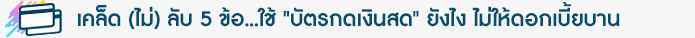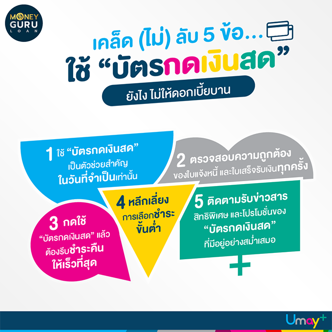5 สเต็ปเทพ!! เคล็ด (ไม่) ลับ ของคนฉลาดเลือก "บัตรกดเงินสด"...ใช้ยังไงไม่ให้ดอกเบี้ยบาน "บัตรกดเงินสด" คือ สินเชื่อ และสินเชื่อเมื่อใช้แล้วก็ต้องเป็นหนี้ แต่เราจะทำยังไงให้การเป็นหนี้ของเราไม่บานปลาย เราเลือกได้ค่ะ ด้วยการมีและอยู่กับหนี้นั้นๆ ให้มีความสุข เพื่อให้การเป็นหนี้ของเราได้รับประโยชน์สูงสุด ซึ่งประโยชน์หลักของบัตรกดเงินสดนั้นสามารถตอบโจทย์คนที่ต้องการใช้เงินด่วนได้ดีและทันเวลาที่สุด แต่เราไม่ต้องกังวลกับภาระหนี้ที่จะเกิดขึ้นจากการใช้บัตรกดเงินสดไปค่ะ เพราะวันนี้ทางทีมงาน