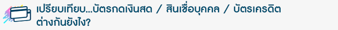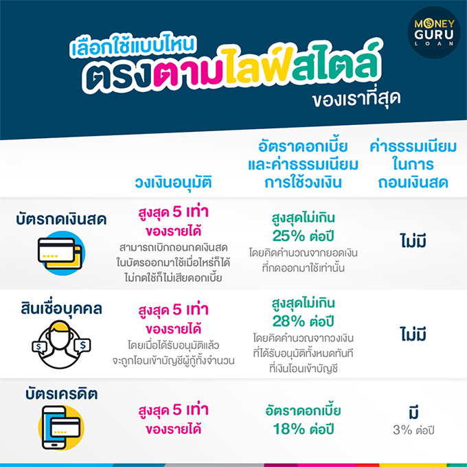 หากยังสงสัยอยู่ว่าระหว่าง บัตรกดเงินสด / สินเชื่อบุคคล / บัตรเครดิต ต่างกันอย่างไร? แล้วเราควรเลือกใช้สินเชื่อแบบไหนที่เหมาะกับเรา...มาดูกันให้ชัดๆ เลยค่ะ
