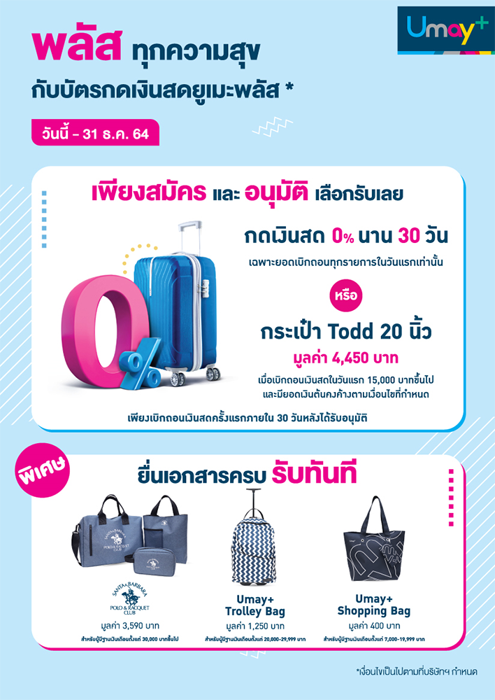 CheckRaka นำมาให้ดูนี้ จะเห็นได้ว่าจุดเด่นของบัตรกดเงินสดใบนี้ จะเด่นในเรื่องของสิทธิประโยชน์ที่ไม่เหมือนกับสถาบันการเงินอื่น นอกเหนือจากนี้ก็เป็นในส่วนของโปรโมชั่นบัตรกดเงินสดยูเมะพลัสที่มีออกมาให้ได้ WoW กันอย่างสม่ำเสมอตลอดทั้งปี ซึ่งถ้าสมัครในช่วงต้นปีแบบนี้ (วันนี้ - 31 ธ.ค. 64) เมื่อได้รับอนุมัติพร้อมเบิกถอนเงินครั้งแรกภายใน 30 วัน จะเลือกรับดอกเบี้ย 0% นาน 30 วัน หรือจะเลือกกระเป๋าเดินทางล้อลาก Todd ขนาด 20 นิ้ว มูลค่า 4,450 บาท