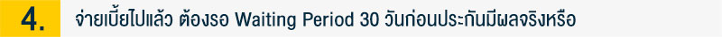 คำตอบคือจริงครับ ประกันสุขภาพเวลาเราจ่ายเงินเบี้ยประกันไปแล้ว จะยังไม่มีผลทันทีนะครับ ต้องรอ 30 วัน (สำหรับกรณีทั่วไป) และ 120 วัน (สำหรับโรคที่ซีเรียสขึ้นมาหน่อย) ภาษาประกันสุขภาพเค้าเรียกเวลานี้ง่ายๆ ว่า "Waiting Period" ผลของ Waiting Period นี้คือ ถ้าบังเอิญเราเพิ่งโอนเงินจ่ายค่าเบี้ยประกันไป แต่ 2 อาทิตย์ถัดมาตรวจเจอโรคบางอย่างที่ต้องเข้ารักษาที่โรงพยาบาล ประกันสุขภาพจะยังไม่ครอบคลุมกรณีนี้ให้ เหตุผลในการมีตรงนี้คือบริษัทประกันต้องการแน่ใจว่าไม่ใช่คนป่วย หรือรู้ตัวว่าอาจป่วยอยู่แล้ว แล้วแอบมาซื้อประกันเพื่อจะเรียกร้องเงินประกัน