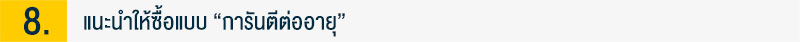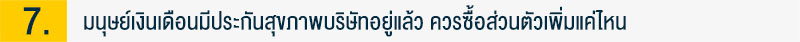 (ข) อาจพิจารณาเลือกซื้อแบบประกันสุขภาพที่มีเงื่อนไขของความรับผิดส่วนแรก (Deductible) ซึ่งหมายถึงการรับภาระค่าใช้จ่ายการรักษาพยาบาลบางส่วนไว้ด้วยตัวเอง เพื่อแลกกับการจ่ายเบี้ยประกันที่ถูกลง โดยในส่วนที่เราต้องรับภาระเองนั้น สามารถใช้ประกันสุขภาพของบริษัทได้