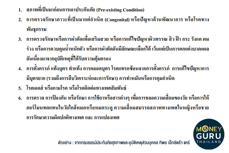 ประกันสุขภาพในเมืองไทยส่วนใหญ่จะไม่รวมเรื่องความเสี่ยง หรือบาดเจ็บที่อาจเกิดขึ้นจากการรักษา หรือผ่าตัดเพื่อความสวยความงาม ไม่ว่าจะเป็น Plastic & Cosmetic Surgery หรือการทำพวก Botox หรือ Filler ต่างๆ นะครับ ดังนั้น ถ้าเราไปใช้บริการพวก Beauty Clinic หรือคลินิครักษาสิวที่ไม่ได้มาตรฐาน แล้วเกิดอุบัติเหตุอะไรต่อเนื่องมา ประกันสุขภาพจะไม่ครอบคลุม นอกจากเรื่องความสวยความงามแล้ว ยังมีเรื่องความเจ็บป่วยอื่นๆ อีก ที่โดยปกติประกันสุขภาพจะไม่ครอบคลุมด้วย หลักๆ ก็เช่น (อาจแตกต่างกันไปแต่ละกรมธรรม์ แต่ส่วนใหญ่จะประมาณนี้)