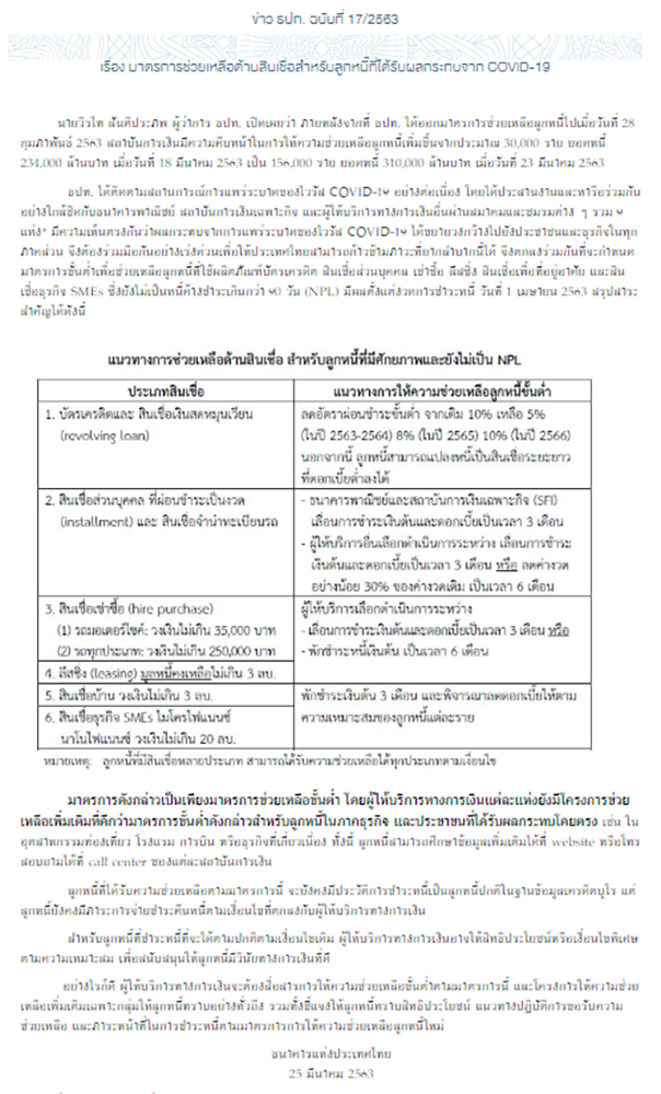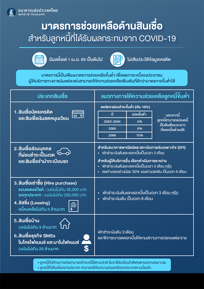 จากมาตรการที่ทาง ธปท.ได้ประสานงานและร่วมมือกับธนาคารพาณิชย์ สถาบันการเงินเฉพาะกิจ และผู้ให้บริการทางการเงินอื่นผ่านสมาคม และชมรมต่างๆ ให้มีความร่วมมือกันอย่างเร่งด่วนด้วยการกำหนดมาตรการขั้นต่ำเพื่อช่วยเหลือลูกหนี้ที่ใช้ผลิตภัณฑ์บัตรเครดิต สินเชื่อส่วนบุคคล เช่าซื้อ ลีสซิ่ง สินเชื่อเพื่อที่อยู่อาศัย และสินเชื่อธุรกิจ SMEs ที่ยังไม่เป็นหนี้ค้างชำระเกินกว่า 90 วัน (NPL) โดยให้มีผลตั้งแต่งวดการชำระหนี้ วันที่ 1 เมษายน 2563