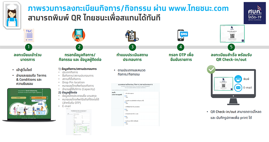 แพลตฟอร์ม "ไทยชนะ" ใช้เพื่อ Check In - Check Out ก่อนเข้าและหลังใช้บริการ โดยมีขั้นตอน ดังนี้