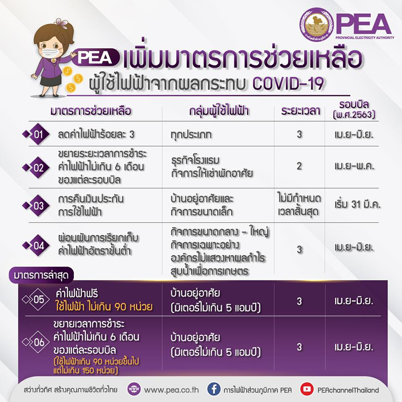 จากมาตรการล็อคดาวน์ หรือการประกาศใช้ พ.ร.บ.ฉุกเฉินฯ ในสถานการณ์การแพร่ระบาดเชื้อไว้รัส COVID-19 ส่งผลทำให้เศรษฐกิจเกิดการชะลอตัวลง ร้านค้า หรือสถานที่ต่างๆ ต้องปิดบริการเป็นเวลานาน ทำให้ประชาชนส่วนใหญ่รายได้ก็ต้องลดลงไปด้วย ดังนั้น รัฐบาลจึงมีมาตรการช่วยเหลือในส่วนของค่าไฟฟ้า โดยได้รับความร่วมมือจากการไฟฟ้านครหลวง (กฟน.) และการไฟฟ้าส่วนภูมิภาค (กฟภ.) ทั้งหมด 6 มาตรการหลักๆ ดังนี้