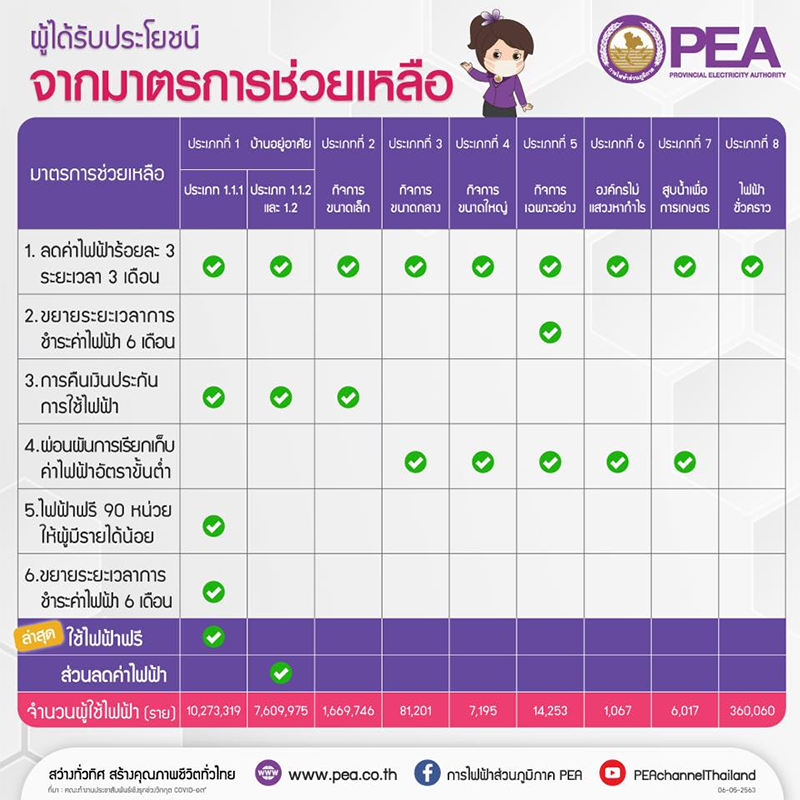 มาตรการช่วยเหลือกลุ่มผู้ใช้ไฟฟ้าที่เป็นประเภทบ้านอยู่อาศัย จะได้รับสิทธิ์ใช้ไฟฟ้าฟรีเป็นระยะเวลา 3 เดือน เริ่มตั้งแต่ใบแจ้งค่าไฟฟ้าเดือนมีนาคม - พฤษภาคม 2563 โดยใช้หน่วยการใช้ไฟฟ้าตามใบแจ้งค่าไฟฟ้าของเดือนกุมภาพันธ์ 2563 เป็นฐานในการเปรียบเทียบการคำนวณค่าไฟฟ้าตามมาตรการที่กำหนด คือ