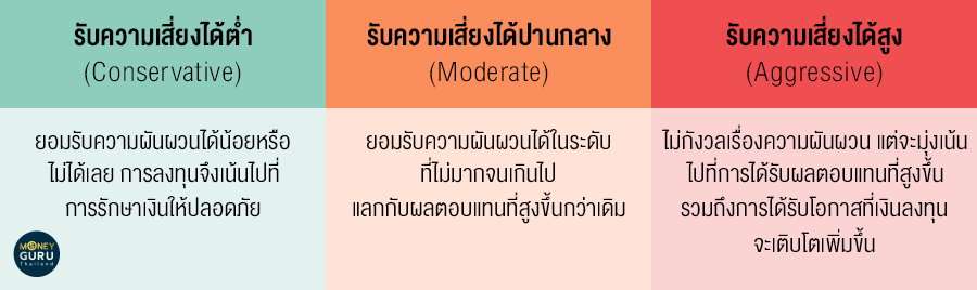 และสิ่งที่สำคัญที่สุดของการรู้จักตัวเองนี้ เราจะต้องสำรวจตัวเองว่า "ยอมรับความเสี่ยงได้แค่ไหน?" เพราะระดับความเสี่ยงของเรานี้เองจะเป็นทางเลือกให้เราว่าเราควรเลือกลงทุนแบบไหน และสัดส่วนการลงทุนแบบใดที่เหมาะกับเรามากที่สุด