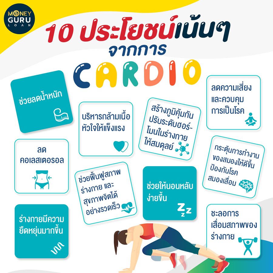 สรุป...การเผาผลาญแบบ Cardio ทั้งในเรื่องของการออกกำลังกายเพื่อให้ร่างกายแข็งแรง และการลงทุนเพื่อให้เงินออมงอกเงยมากขึ้นนั้น ล้วนแล้วแต่มีความสำคัญกับชีวิตเราทั้งสิ้น เพราะถ้าหากเรามีร่างกายที่แข็งแรง หุ่นเฟิร์มสวย แต่ไม่รู้จักการลงทุนเลย จะส่งผลทำให้ในอนาคตเราไม่มีความมั่นคงในเรื่องการเงินซึ่งก็จะทำให้เรามีปัญหากับการใช้ชีวิตในอนาคต และในทางกลับกันถ้าเรามีฐานะที่มั่นคงจากการลงทุนแล้ว แต่ไม่สนใจที่จะดูแลร่างกายหรือออกกำลังกายเลย เงินทองที่ได้มานั้นก็จะไม่มีประโยชน์อะไรเลยถ้าเราจะต้องเอามาใช้จ่ายกับการรักษาโรค หรือมันจะหมดค่าทันทีถ้าต้องอายุสั้นจากโลกนี้ไปก่อนเวลาอันควร ทั้งๆ ที่ยังไม่ได้ใช้เงินที่หามา..