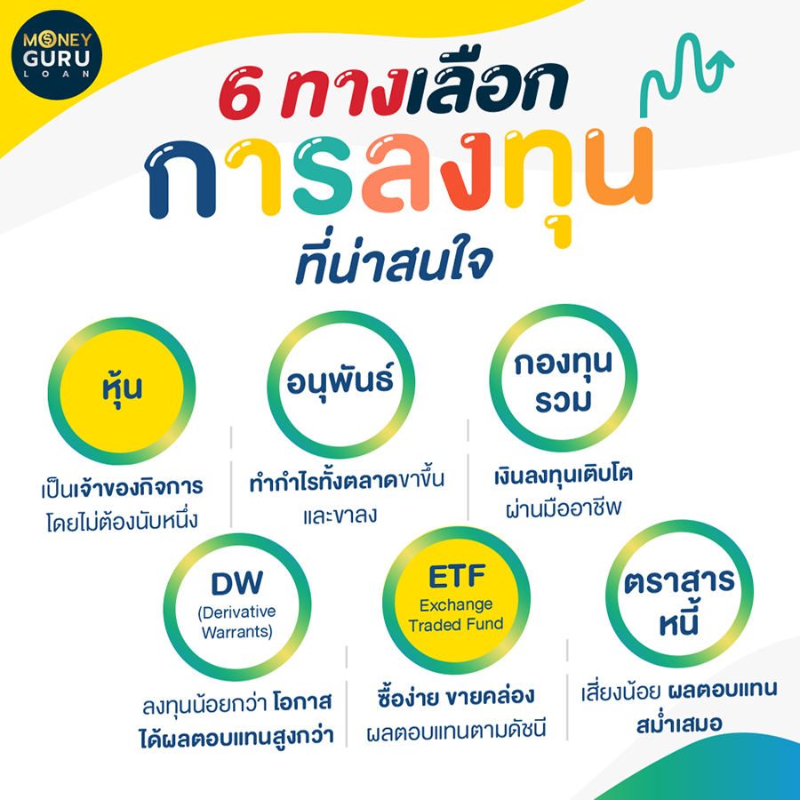 ทางเลือกการลงทุน...มีกี่แบบ? ถ้าพูดถึงเรื่องการออมแล้ว เชื่อว่าหลายคนคงต้องนึกถึง "เงินฝากธนาคาร" แต่ปัจจุบันการฝากเงินไว้กับธนาคารนั้น ผลตอบแทนหรือดอกเบี้ยที่ได้รับนั้นน้อยนิดเหลือเกิน การที่เราจะมีเงินออมไปถึงเป้าหมายที่ตั้งไว้ก็อาจจะต้องใช้เวลายาวนานมาก ดังนั้น การลงทุน จึงเป็นอีกหนึ่งทางเลือกสำหรับผู้ที่ต้องการได้รับผลตอบแทนที่มากขึ้นในระยะเวลาที่สั้นลงด้วย ซึ่งทางเลือกของการลงทุนในปัจจุบันก็มีอยู่มากมายเช่นกัน วันนี้ทางทีมงาน CheckRaka จะขอเอาตัวเลือกการลงทุนที่แบ่งเป็น 6 ประเภทใหญ่ๆ มาให้เพื่อนๆ ได้รู้จักตามนี้ค่ะ