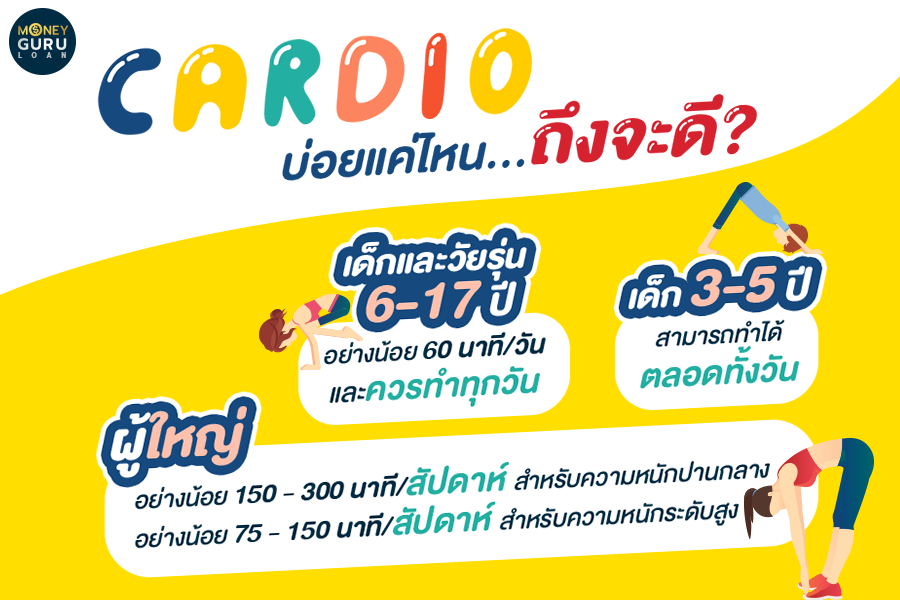 ควรออกกำลังกายแบบ Cardio บ่อยแค่ไหน? การ Cardio เป็นกิจกรรมทางกายที่ควรทำอย่างสม่ำเสมอ และเป็นประจำ เพื่อทำให้รู้สึกดีขึ้น ใช้ร่างกายได้ดีขึ้น นอนหลับดีขึ้น และลดความเสี่ยงของการเกิดโรคเรื้อรังได้ ซึ่งถ้าถามว่าเราควรออกกำลังกายแบบ Cardio มากน้อย หรือบ่อยแค่ไหนนั้น...สามารถแยกตามช่วยอายุได้ดังนี้