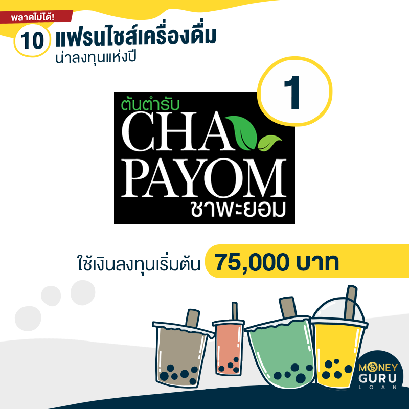 1. ชาพะยอม... CHA PAYOM ชาพะยอมได้รับความนิยมจากคนที่ชื่นชอบในการดื่มชาด้วยจุดเด่นของรสชาติ มีความเป็นแบรนด์ยอดนิยม และเต็มไปด้วยความพิถีพิถัน ซึ่งต้นตำรับชาพะยอมนั้นมีสูตรเฉพาะและลับสุดยอด จนทำให้มีรสชาติที่อร่อย...และไม่เหมือนใคร