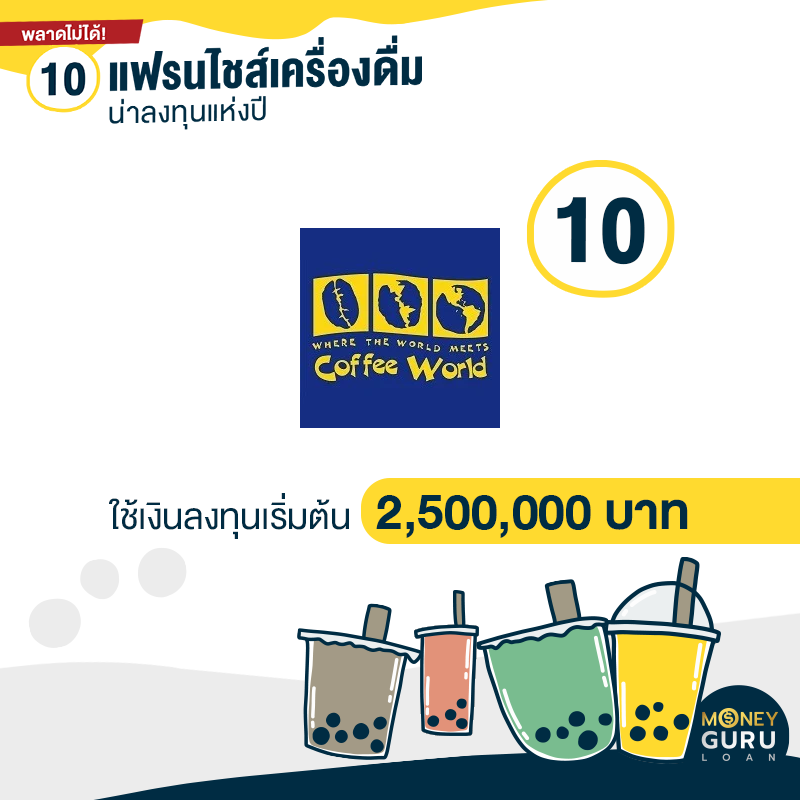 10. คอฟฟี่ เวิลด์... COFFEE WORLD Coffee World เปิดตัวในปี 1997 เป็นร้านกาแฟที่เป็นมิตร ซึ่งให้บริการกาแฟร้อนและเย็นหลากหลายชนิดพร้อมอาหารสดใหม่ที่สามารถเพลิดเพลินได้อย่างกลมกลืน เช่น วาฟเฟิลที่เป็นเอกลักษณ์ เค้ก แซนวิช มัฟฟิน ซุป และสลัด ปัจจุบันคอฟฟี่เวิลด์ได้ขยายสาขาไปแล้วกว่า 90 สาขาใน 4 ประเทศโดยผลิตภัณฑ์ได้รับการปรับแต่งเพื่อให้เข้ากับความอ่อนไหวทางวัฒนธรรมและความชอบในแต่ละประเทศ เพื่อส่งมอบกาแฟและเครื่องดื่มอื่น ๆ ที่น่าเพลิดเพลินที่สุดให้กับโลกเสริมด้วยอาหารและของว่างที่ปรุงอย่างเอร็ดอร่อยในบรรยากาศที่อบอุ่นและน่าดึงดูดใจ