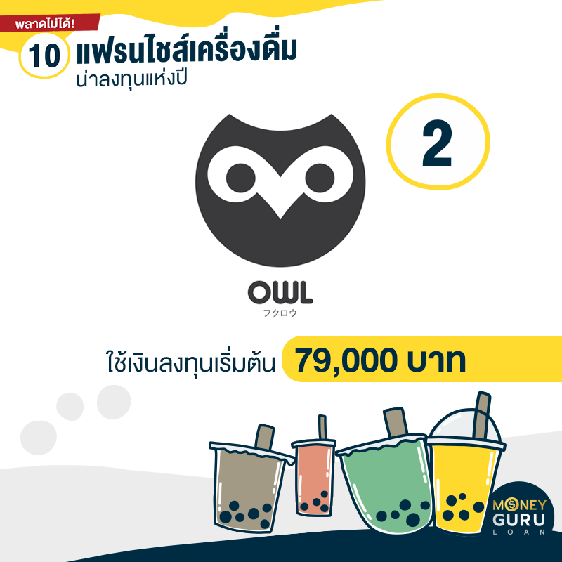 2. อาวน์ชา... OWL CHA อาวน์ชา ได้รับการตอบรับเป็นอย่างดีจากทุกๆ กลุ่มลูกค้า ทำให้มีสาขาทั่วประเทศกว่า 150 สาขา ด้วยความแตกต่างในทุกๆ รายละเอียดทั้งของแบรนด์ และตัวสินค้า ที่คัดสรรวัตถุดิบชั้นดีทั้งในและต่างประเทศ กับเทคนิคการต้มชา และไข่มุกในแบบฉบับของอาวน์ชา จึงทำให้ได้เครื่องดื่มชาชั้นดีในราคาย่อมเยาว์สำหรับทุกคน