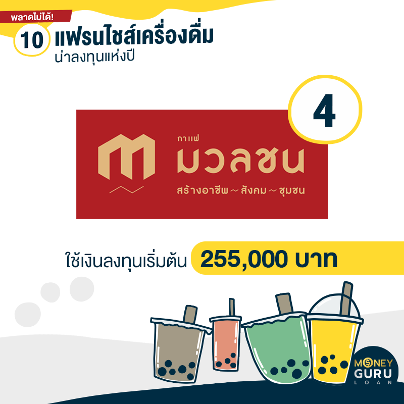 4. กาแฟมวลชน... MUANCHON CAFE กาแฟมวลชน ธุรกิจกาแฟที่ใครๆ ก็เป็นเจ้าของได้ ด้วยรูปแบบแฟรนไชส์ที่ตอบโจทย์ผู้ประกอบการมากที่สุด ผ่านการพิจารณาคัดเลือกจากปัจจัยที่เหมาะสม ภายใต้แนวคิดการทำธุรกิจควบคู่ไปกับสังคมและชุมชน ไม่เอาเปรียบสังคม ไม่มุ่งหวังเพียงแต่ผลกำไร เน้นการให้ความรู้ด้านการบริหารจัดการที่มีระบบและเป็นมาตรฐานสากล ในงบประมาณที่ผู้ประกอบการกำหนดได้เอง เพื่อให้ธุรกิจสามารถดำเนินการไปได้อย่างยั่งยืน