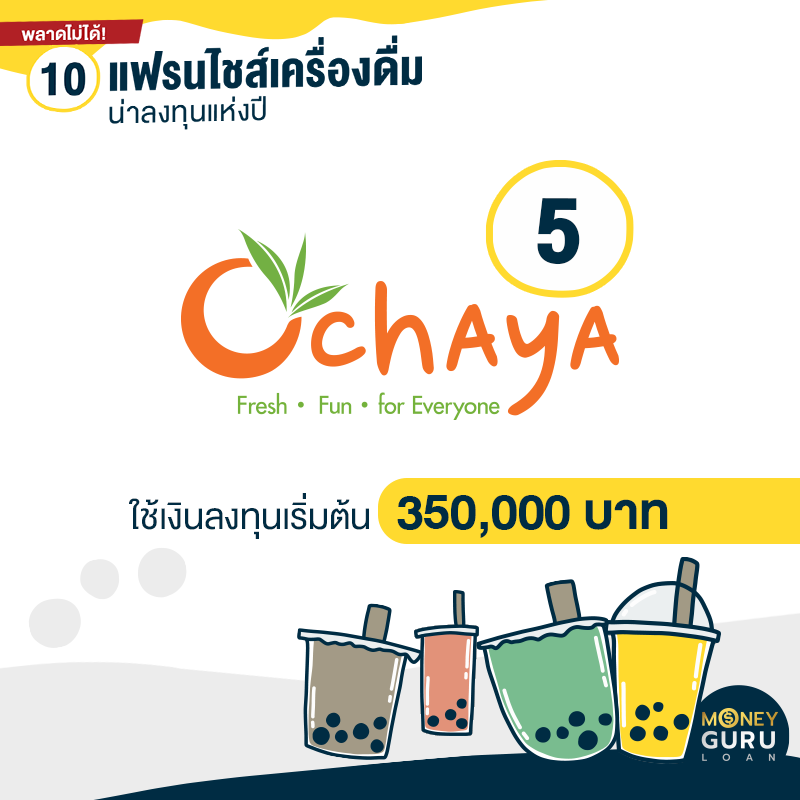 5. โอชายะ... Ochaya โอชายะเป็นแฟรนไชส์าที่ประสบความสำเร็จในด้านชานม ไข่มุก และน้ำผลไม้ด้วยร้านค้ากว่า 350 ร้านทั่วประเทศ โดยมุ่งมั่นที่จะเติบโตอย่างต่อเนื่องในประเทศไทย