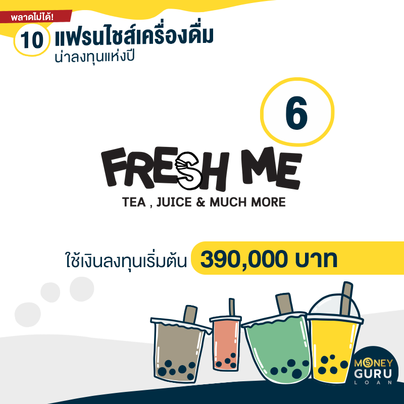 6. เฟรชมี... FRESH ME FRESH ME เป็นแบรนด์ธุรกิจเครื่องดื่มที่ประสบความสำเร็จโดยนักธุรกิจรุ่นใหม่ สาขาแรกที่มหาวิทยาลัยธรรมศาสตร์ หัวใจสำคัญ คือการคัดสรรวัตถุดิบที่มีคุณภาพดี เกรดพรีเมียมจากทั้งภายในและต่างประเทศ ทำให้เครื่องดื่ม FRESH ME มีรสชาติที่เป็นเอกลักษณ์ มีการพัฒนาสูตรเครื่องดื่มใหม่ๆ อย่างต่อเนื่อง โดยเทคนิคการชงชาที่เป็นสูตรลับเฉพาะ ทำให้ได้กลิ่นชาที่หอมตั้งแต่คำแรก
