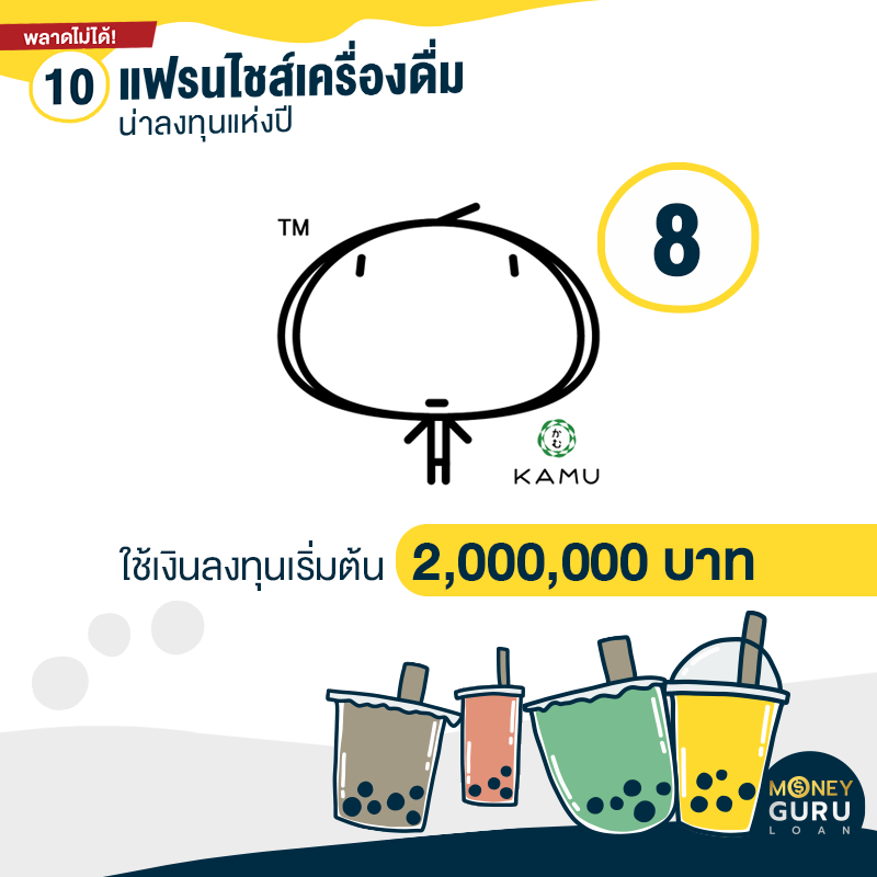 8. คามุ... KAMU TEA KAMUTEA เกิดขึ้นในปี 2554 เป้าหมายมุ่งเน้นไปที่แนวคิดสร้างสรรค์ควบคู่ไปกับการวิจัยและพัฒนาผลิตภัณฑ์ที่เป็นนวัตกรรมความสำเร็จ ส่วนใหญ่เกิดจากแนวคิดของแบรนด์ "คามู" ที่ตราตรึงอยู่ในใจลูกค้าซึ่งเป็นแรงบันดาลใจให้มีมากกว่า 80 สาขาทั่วประเทศไทย และขยายไปทั่วโลกเพื่อเป็นการแบ่งปันรสชาติแห่งความสุขของเราให้โลกรู้