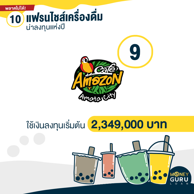 9. คาเฟ่ อเมซอน... AMAZON ร้านกาแฟ Cafe Amezon เกิดขึ้นครั้งแรกในปี 2545 เพื่อเพิ่มศักยภาพทางการตลาดของสถานีบริการน้ำมัน ปตท. สร้างรายได้ให้กับสถานีฯ และตอบสนองต่อไลฟ์สไตล์ของผู้บริโภคและคนเดินทางได้มากขึ้น โดยตลอดระยะเวลาที่ผ่านมา ร้าน CafeAmazon ถูกพัฒนาให้เป็นจุดนัดพบ แหล่งพักผ่อน สำหรับคนเดินทาง ตกแต่งด้วยโทนสีเขียว นำเสนอภาพลักษณ์แนวธรรมชาติ โดยใช้สวนหย่อมและน้ำพุเพื่อสร้างบรรยากาศร่มรื่น เย็นสบาย ความรู้สึกผ่อนคลาย และเอกลักษณ์รสชาติเครื่องดื่มกาแฟที่เข้มข้น จึงกลายมาเป็นสโลแกนที่ว่า "Taste of Nature"