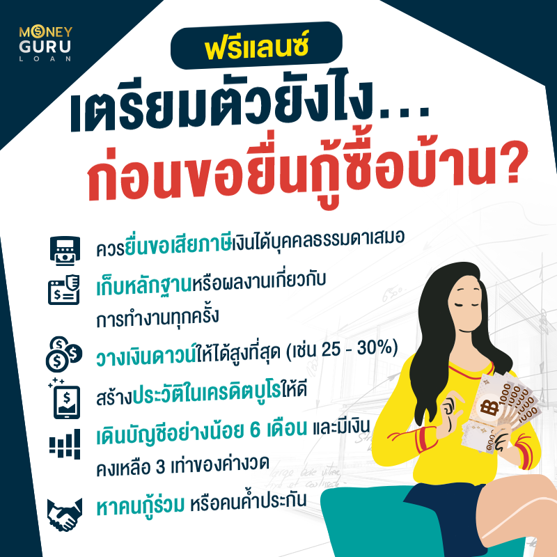 "ฟรีแลนซ์" เตรียมตัวยังไง... ก่อนขอยื่นกู้ซื้อบ้าน? เมื่อเรามีอาชีพเป็นฟรีแลนซ์ และจะมีการวางแผนจะซื้อบ้านเป็นของตัวเอง เราจะต้องมีการเตรียมตัวนะคะ ซึ่งวิธีการเตรียมตัวก็ไม่ยากอย่างที่หลายคนคิดกันค่ะ ถ้าพร้อมแล้วก็มาเตรียมตัวไปพร้อมกันเลย ดังนี้