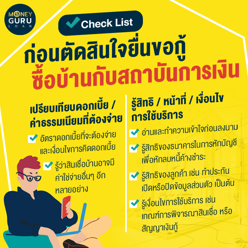 "Check List" ก่อนตัดสินใจยื่นขอกู้ซื้อบ้านกับสถาบันการเงิน Check List เป็นสิ่งจำเป็นที่ต้องทำก่อนตัดสินใจจะซื้อบ้านสักหลัง เพื่อเป็นแนวทางให้เราเตรียมความพร้อมได้ล่วงหน้า ไม่พลาด ด้วยการทำเรื่องยากให้เป็นเรื่องง่าย เมื่อยื่นกู้ซื้อบ้านกับธนาคารแล้วได้รับการอนุมัติแบบผ่านฉลุย