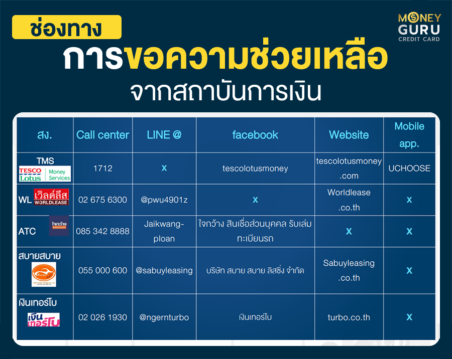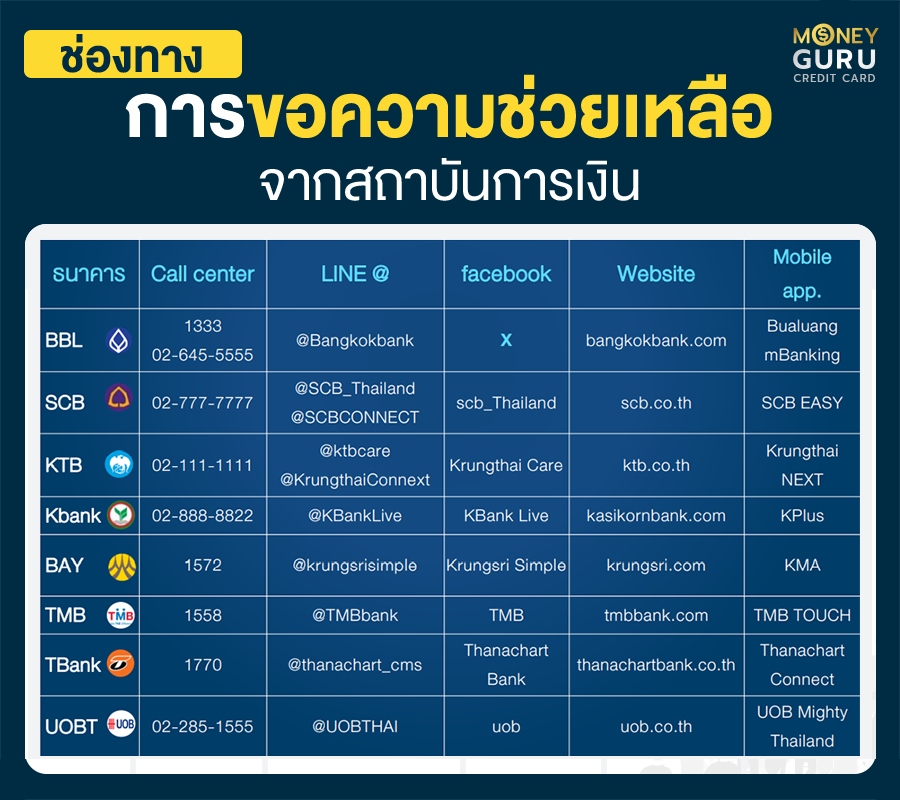3) กรณีไม่สามารถสมัครขอความช่วยเหลือจากทั้ง 2 ทางข้างต้นได้ ก็ให้โทร. ติดต่อเจ้าหน้าที่สถาบันการเงินที่ต้องการขอความช่วยเหลือโดยตรงได้เลย (ซึ่งวิธีนี้อาจจะเกิดปัญหาจากการรอสายนานมาก)