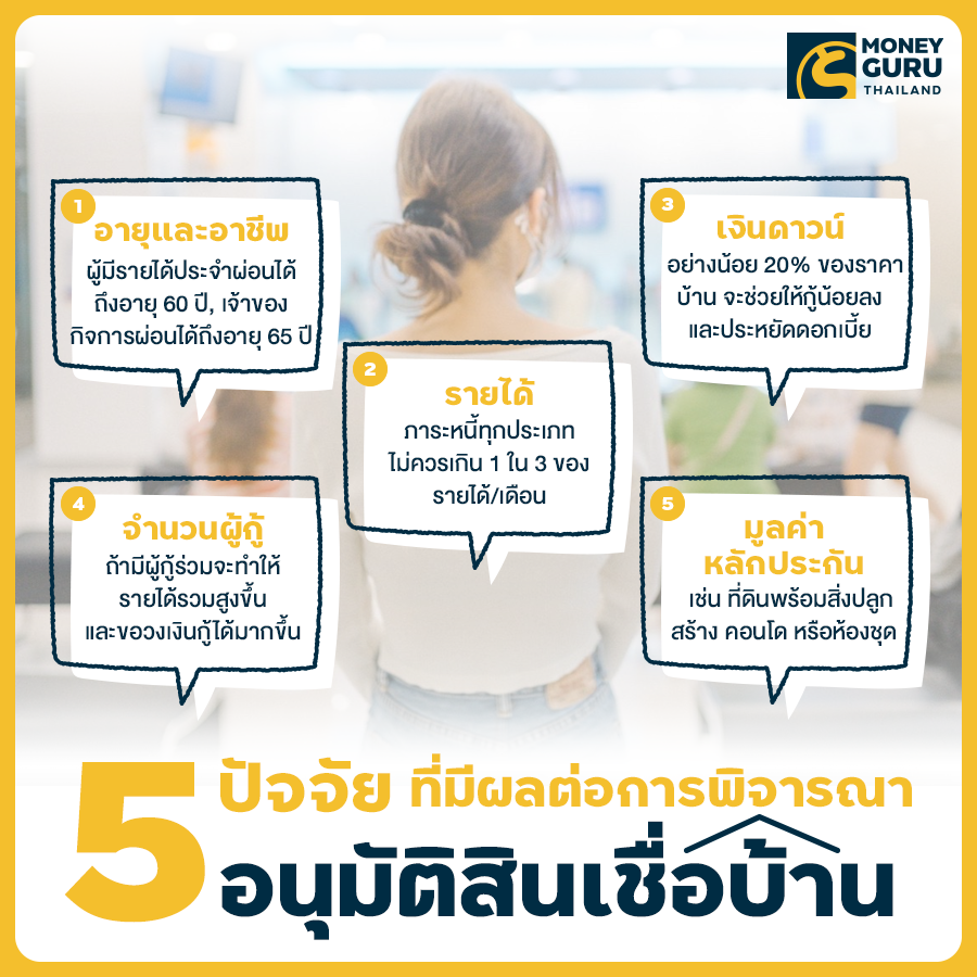 Tips น่ารู้ GURU อยากบอก!! รู้เขา...รู้เรา คิดก่อนผ่อนบ้าน ประสบการณ์ตรงจากการบอกเล่าของผู้กู้ซื้อบ้านจริงอย่างคุณโสรญาที่มาแชร์ประสบการณ์ให้เพื่อนๆ ได้รู้กันนั้น นับว่าเป็นประสบการณ์ที่ดี และได้รับการบริการอย่างสะดวกสบายทั้งจากโครงการบ้าน และสถาบันการเงินที่เลือกกู้ ทำให้การมีบ้านเป็นของตัวเองนั้นผ่านฉลุย (ต้องขึ้นอยู่กับอนาคตการผ่อนชำระที่เหลือด้วยนะคะ) ทั้งนี้ GURU อยากบอกเพื่อนๆ ทุกคนว่า สิ่งสำคัญที่สุดของการซื้อบ้านด้วยการขอสินเชื่อ นั่นก็คือ การเลือกบ้านที่มีราคาเหมาะกับความสามารถในการผ่อนชำระหนี้ แล้วจะทำให้เราอยู่กับหนี้อย่างเป็นสุขค่ะ ซึ่งข้อนี้ก็จะเป็นหนึ่งในปัจจัยที่มีผลต่อการพิจารณาอนุมัติสินเชื่อของสถาบันการเงินด้วยค่ะ มาถึงตอนนี้ Tips น่ารู้ที่ GURU อยากบอก ให้เพื่อนๆ ได้คิดก่อนผ่อนบ้าน ก็คือ ปัจจัยที่มีผลต่อการพิจารณาอนุมัติสินเชื่อซื้อบ้าน มีอะไรบ้าง? มาดูและทำความเข้าใจไปพร้อมกันเลยค่ะ