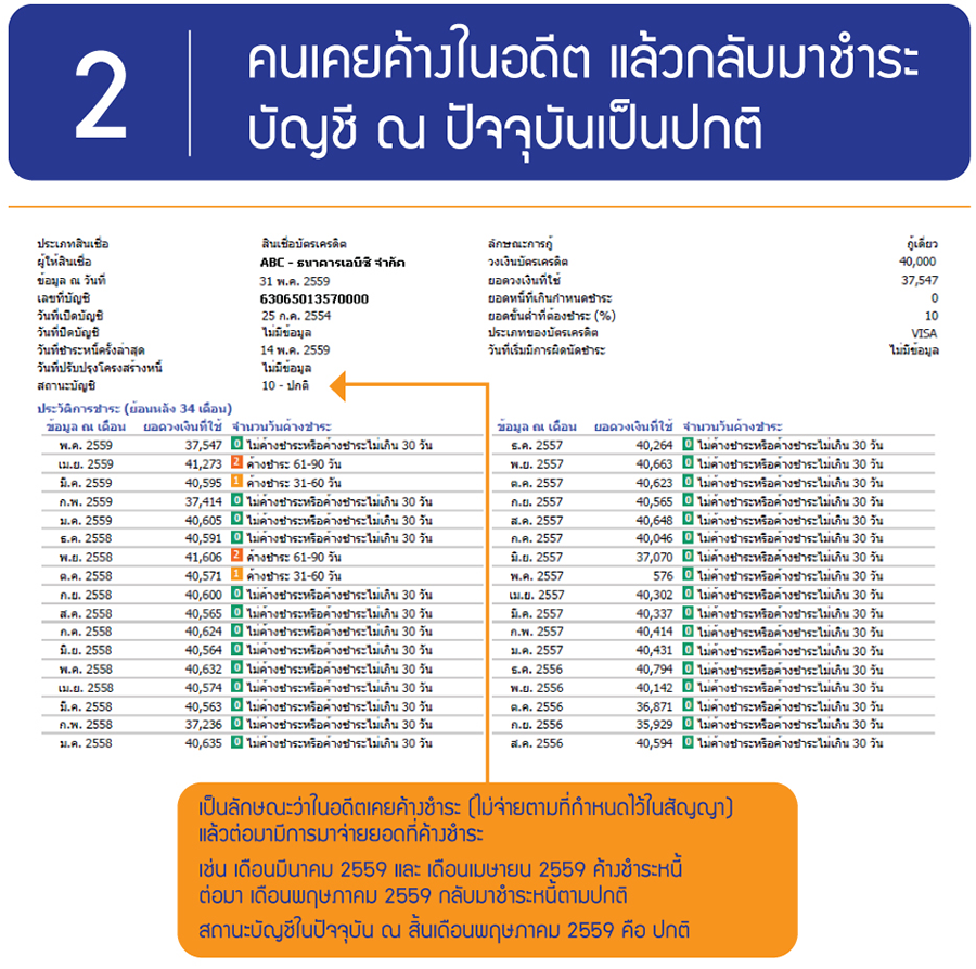ส่วนที่ 2 ข้อมูลเกี่ยวกับ "หนี้สิน" ต่างๆ เช่น ประวัติการขอ การได้รับอนุมัติสินเชื่อ และการชำระสินเชื่อ รวมทั้งประวัติการชำระราคาสินค้า หรือบริการโดยบัตรเครดิตด้วย โดยคำว่า "สินเชื่อ" ตามกฎหมายเครดิตบูโรในที่นี้จะไม่ได้จำกัดเฉพาะการกู้ยืมเงินสินเชื่อบ้าน สินเชื่อเงินสด หรือสินเชื่อส่วนบุคคลเท่านั้น แต่จะรวมถึงเช่าซื้อรถยนต์ ลิสซิ่ง ค้ำประกัน ให้ยืมหลักทรัพย์ เป็นต้น