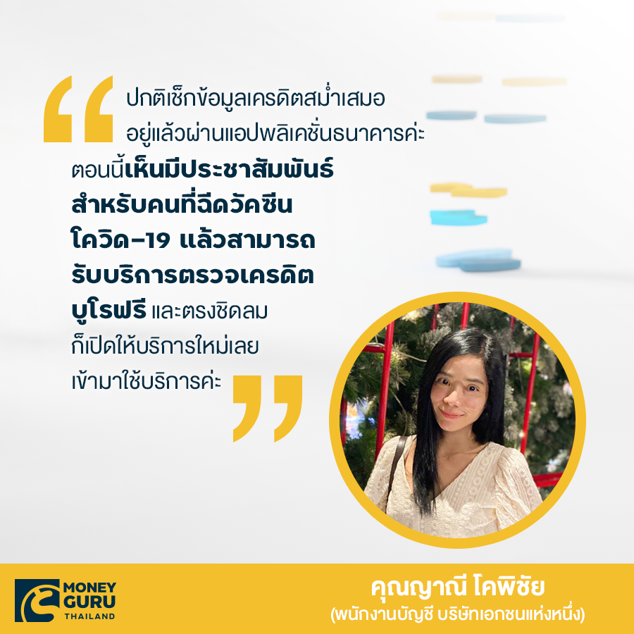 สำหรับลูกค้าที่เข้ารับการฉีดวัคซีนป้องกันโควิด-19 แล้วสามารถนำหลักฐานแก่เจ้าหน้าที่เครดิตบูโร จะได้รับบริการตรวจเครดิตบูโร...เพื่อรับรายงานเครดิตบูโรรูปแบบเอกสารฟรี! หรือรับอีคูปองเพื่อใช้บริการ "ตู้ตรวจเครดิตบูโรด้วยตนเอง (ตู้คีออส)" เพื่อรับรายงานเครดิตบูโรรูปแบบอิเล็กทรอนิกส์ (NCB e-Credit Report) ฟรี! ทางอีเมลได้ทันที ตั้งแต่วันที่ 24 พฤษภาคม ถึง 30 มิถุนายน 2564 ได้ที่ศูนย์ตรวจเครดิตบูโรบนสถานีรถไฟฟ้า BTS (ภายในสถานี) ทุกแห่ง (