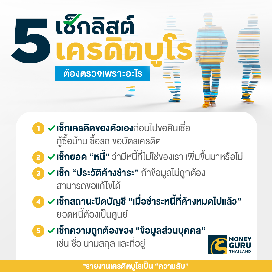 ทำไมต้องตรวจเครดิตบูโร คงเป็นคำถามในใจใครหลายๆ คน เพราะบางคนก็อาจจะคิดว่าพอสิ้นปีสถาบันการเงินต่างๆ ก็จะส่งเอกสารเครดิตบูโรของสินเชื่อที่เรามีมาให้อยู่แล้ว แต่การตรวจเครดิตบูโร จริงๆ แล้วก็เพื่อให้เรามั่นใจว่าข้อมูลการเป็นหนี้ของเรามีความถูกต้องเอกสารจะรายงานยอดหนี้ทั้งหมด รวมถึงบัญชีไหนปิดไปแล้วก็ต้องมียอดหนี้เป็น 0 บาท บัญชีไหนจ่ายตรงตามเงื่อนไขก็ต้องระบุว่าไม่ค้างชำระหรือค้างไม่เกิน 30 วัน ถือเป็นการป้องกันการแอบอ้างเอกสารส่วนตัวของเรา เช่น ปลอมแปลงสำเนาบัตรประชาชน เอกสารทางการเงินที่มักรับรองสำเนาบ่อยๆ ไปสมัครสินเชื่อ ซึ่งอาจทำให้เรามีหนี้งอกมาโดยไม่รู้ตัวได้ หากเราตรวจเครดิตบูโรอย่างสม่ำเสมอก็จะเป็นการช่วยรีเช็กสถานะหนี้สินของเราได้อีกทางหนึ่งค่ะ