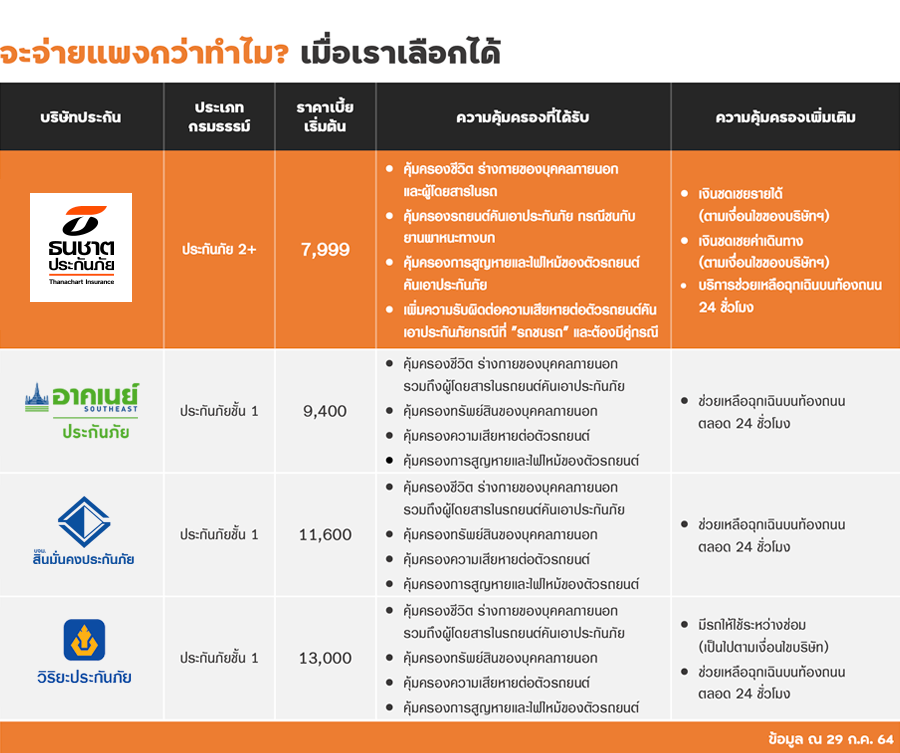สุดในรุ่น...ด้วย "ประกันภัยรถยนต์ธนชาต 2+ จัดเต็ม” เหมาะกับใครมากที่สุด ขึ้นชื่อว่า "ประกันภัยรถยนต์" แล้ว ถ้าถามว่าแบบไหนดีที่สุด หลายคนก็คงตอบว่า "ประกันภัยชั้น 1" เพราะให้ความคุ้มครองครบทุกด้าน แน่นอนว่าค่าเบี้ยประกันก็แพงที่สุดเช่นกัน ซึ่งในอดีตส่วนใหญ่จะได้รับการแนะนำมาว่า ให้เลือกซื้อประกันภัยรถยนต์ที่เหมาะกับการใช้งานของเรา คุ้มครองครอบคลุมสูงสุด และจะต้องไม่จ่ายเงินเกินความจำเป็น เพราะเราต้องไม่ลืมว่าจะต้องซื้อประกันภัยรถยนต์ทุกปี ดังนั้น เราควรเลือกซื้อประกันภัยรถยนต์ที่เหมาะกับพฤติกรรมการใช้รถ ใช้ถนน และความเสี่ยงที่อาจจะเกิดขึ้นกับเราให้มากที่สุด แต่!! อย่าเพิ่งเทใจไปให้กับการเลือกซื้อประกันภัยรถยนต์ชั้น 1 ทั้งหมดนะคะ เพราะปัจจุบันได้มีประกันภัยที่ให้ความคุ้มครองเหมือน หรืออาจจะเพิ่มเติมบริการที่มากกว่าประกันภัยชั้น 1 แต่จ่ายในราคาถูกกว่าอย่างเช่น "ประกันภัยรถยนต์ธนชาต 2+ จัดเต็ม" ของบริษัทธนชาตประกันภัย โดยแบบประกันภัยนี้เราจะได้รับความคุ้มครองที่เหมาะสม คุ้มค่า โดนใจ และที่สำคัญคือไม่ต้องจ่ายเบี้ยประกันที่สูงเกินความจำเป็นอีกต่อไป (ตามข้อมูลที่ทาง CheckRaka ได้นำเสนอข้างต้น) เพราะฉะนั้น พูดได้เต็มปากเลยค่ะว่า..."ประกันภัยรถยนต์ธนชาต 2+ จัดเต็ม" เหมาะกับทุกคนจริงๆ ค่ะ ซึ่งมีข้อแตกต่างเล็กน้อยจากประกันภัยชั้น 1 นั่นก็คือ จะคุ้มครองทุกกรณีที่เป็น "รถชนรถ" เท่านั้น (ต้องมีคู่กรณี) นอกนั้นความคุ้มครองก็เทียบเท่ากับประกันภัยรถยนต์ชั้น 1 เลยค่ะ ไม่ว่าจะเป็นคนที่ไม่ค่อยได้ใช้รถ หรือเป็นคนใช้รถดี ไม่มีเฉี่ยวชน แต่มีความต้องการความคุ้มครองที่ครอบคลุม แถมไม่ต้องการจ่ายแพงกว่า ก็ต้องยกให้ความสุดในรุ่นอย่าง "ประกันภัยรถยนต์ธนชาต 2+ จัดเต็ม" นี้ไปเลยค่ะ