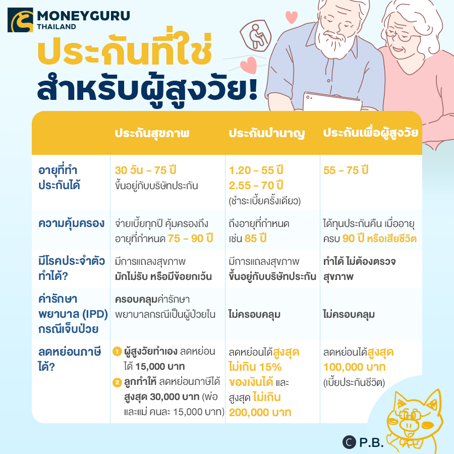 สำหรับท่านที่กำลังจะเข้าวัยเกษียณ หรือถึงวัยเกษียณแล้ว หรือท่านไหนอยากทำประกันให้คุณพ่อคุณแม่ โดยหลักแล้ววัยเกษียณจะเป็นวัยที่ไม่มีรายได้ประจำ แต่ยังมีค่าใช้จ่ายในชีวิตประจำวัน และค่ารักษาพยาบาลที่มักจะเพิ่มขึ้นตามอายุของเราค่ะ ที่นี่เรามาเช็กกันค่ะว่าเรามีทางเลือกอะไรบ้าง P.B. ขอสรุปประกันหลักที่เกี่ยวข้องกับวัยเกษียณไว้ให้ดังนี้ค่ะ