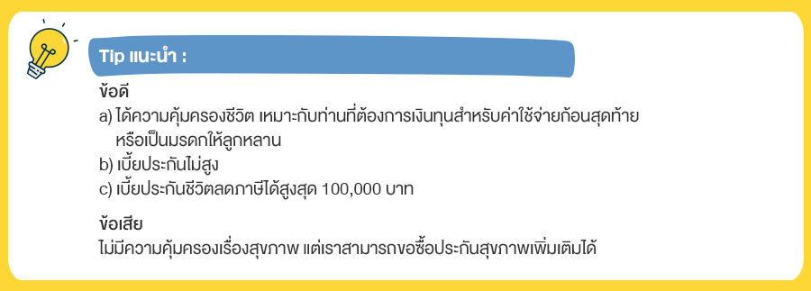 คือ แบบประกันที่คุ้มครองกรณีเสียชีวิต โดยผู้รับผลประโยชน์จะได้เงินทุนประกันกรณีผู้ทำประกันเสียชีวิต หรือหากผู้ทำประกันมีอายุครบสัญญาเช่น 90 ปี ก็จะได้รับเงินทุนประกันคืนเช่นกันค่ะ การจ่ายเบี้ยประกันนั้นสามารถเลือกได้จากแบบประกันที่เลือก เช่น แบบชั่วระยะเวลาหนึ่ง - 15 ปี หรือ 20 ปี หรือจ่ายเบี้ยตลอดทุกปี โดยมักจะคุ้มครองถึงอายุ 85, 90 หรือ อายุ 99 ปีเป็นต้น โดยจะสังเกตได้จากแบบประกันชีวิต เช่น แบบประกันชีวิต 90/21 หมายถึงจ่ายเบี้ยประกัน 21 ปี คุ้มครองชีวิตถึงอายุ 90ปี และอาจได้เงินสมทบพิเศษเพิ่มเติม หรือเงินปันผล ทั้งนี้ขึ้นกับแบบประกันค่ะ