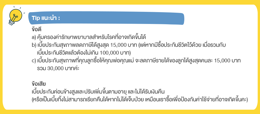 ประกันสุขภาพจะให้ความคุ้มครองเรื่องสุขภาพเป็นหลัก โดยปัจจุบันบริษัทประกันมักให้ทำประกันชีวิตเป็นสัญญาหลัก และสัญญาประกันสุขภาพเป็นสัญญาแนบท้าย หรือสัญญาเพิ่มเติม โดยแบบประกันและเบี้ยประกันมีหลายแบบ ทั้งแบบเบี้ยสูงแต่เหมาจ่าย หรือแบบเบี้ยถูกลงมาแล้วมีค่าที่ผู้ทำประกันต้องจ่ายส่วนแรก (ความรับผิดส่วนแรก deductible) โดยสิ่งที่ต้องคำนึงถึงมีดังนี้ค่ะ