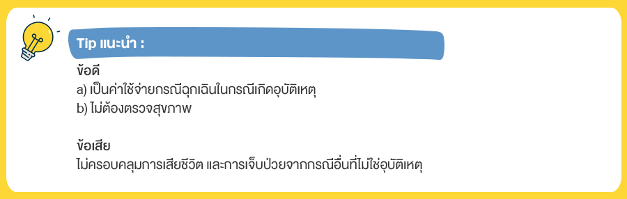 ประกันอุบัติเหตุจะคุ้มครองกรณีเสียชีวิต สูญเสียอวัยวะ ทุพพลภาพ และค่ารักษาพยาบาลจากการบาดเจ็บจากอุบัติเหตุเท่านั้นค่ะจะแตกต่างจากประกันผู้สูงอายุคือ ประกันนี้จะไม่รวมคุ้มครองเรื่องการเสียชีวิต และการเจ็บป่วยจากกรณีอื่นที่ไม่ใช่อุบัติเหตุ