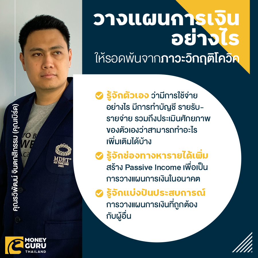 ผมโชคดีตรงที่ผมจบทางด้านบัญชีมา และมีประสบการณ์ด้านการวางแผนให้กับทั้งบริษัท และลูกค้า ทำให้ส่วนตัวได้เตรียมการรองรับสถานการณ์ที่ไม่แน่นอนเช่นนี้ไว้ล่วงหน้า ผมมีการวางแผนสร้าง Passive Income สร้างรายได้จากหลายช่องทาง เลยไม่ค่อยได้รับผลกระทบในส่วนนี้มากนัก โดยผมเริ่มต้นจากรู้ตัวเราก่อนครับ โดยมีการทำบัญชี รายรับ-รายจ่ายของครอบครัว ต้องรู้ว่าเรามีรายจ่ายต่อเดือนเท่าไหร่ อะไรเป็นรายจ่ายจำเป็น อะไรเป็นรายจ่ายที่ไม่จำเป็น และรายได้ต้องมีเท่าไหร่ อย่างน้อยการที่เรารู้ตัวเราเอง ทำให้เราประเมินศักยภาพของตัวเองได้ว่าเราควรทำอะไร เพื่อบริหารการเงินในสถานการณ์ต่างๆ ครับ