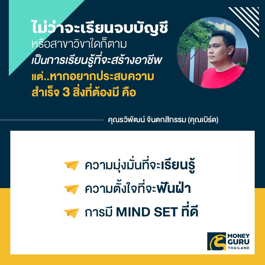 การเรียนในตำราอาจจะทำให้เรามีความรู้ บางแขนงวิชา เช่น บัญชี อาจจะหล่อหลอมให้เราเป็นคนละเอียด รู้เรื่องตัวเลข รู้เรื่องภาษี รู้จักการวางแผน แต่การมุ่งมั่นที่จะเรียนรู้และความตั้งใจจริงอย่างต่อเนื่อง จะทำให้เราพัฒนาตัวเองขึ้นไปอีกขั้น และหากเรายิ่งมี mind set ที่ดีพอด้วยแล้วละก็ จากขั้นที่พัฒนาขึ้นมา ก็จะทำให้เราก้าวไปสู่จุดที่ประสบความสำเร็จได้ครับ