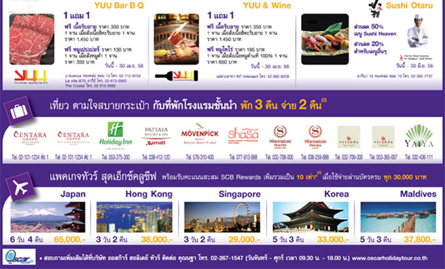 - ใช้จ่ายผ่านบัตรเครดิตไทยพาณิชย์ ภายใต้ ชื่อ - สกุล หมายเลขบัตรเครดิตเดียวกัน ภายในวันเดียวกัน (เฉพาะชำระเต็มจำนวน) ที่ชำระค่าแพคเกจทัวร์ (เฉพาะทัวร์ที่กำหนด ที่บริษัท ออสการ์ ฮอลิเดย์ ทัวร์ ตามที่ระบุข้างต้นเท่านั้น) โดยใช้จ่ายผ่านบัตรฯ ครบทุก 30,000 บาท