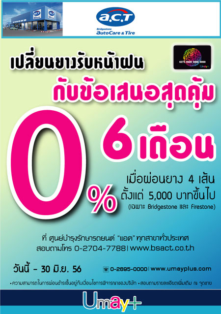 ผ่อนยางกับบัตรยูเมะ พลัส แบ่งชำระรายเดือนสบายๆรับหน้าฝน ที่ศูนย์บำรุงรักษารถยนต์ "แอค" ทุกสาขาทั่วประเทศ ข้อเสนอสุดคุ้ม 0% นาน 6 เดือน เมื่อผ่อนยางครบ 4 เส้น ตั้งแต่ 5,000 บาทขึ้นไป (เฉพาะ Bridgestone และ Firestone)วันนี้ - 30 มิถุนายน 2556 เท่านั้นสอบถามรายละเอียดเพิ่มเติมที่ "แอค" ทุกสาขาทั่วประเทศ