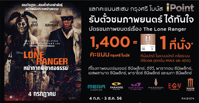 สิทธิพิเศษสำหรับลูกค้าผู้ถือบัตรเครดิตธนาคารกรุงศรีฯ สามารถนำคะแนนสะสม กรุงศรี โบนัส iPoint 1,400 คะแนน แลกรับบัตรชมภาพยนตร์เรื่อง The Lone Ranger ในระบบปกติ หรือระบบดิจิตอล (ยกเว้น IMAX และ 4DX) ที่โรงภาพยนตร์เมเจอร์ซีนีเพล็กซ์, อีจีวี, พารากอน ซีนีเพล็กซ์, เอสพลานาด ซีนีเพล็กซ์, พาราไดซ์ ซีนีเพล็กซ์ และเมกา ซีนีเพล็กซ์ ระหว่างวันที่ 4 ก.ค.- 3 ส.ค.56 นี้